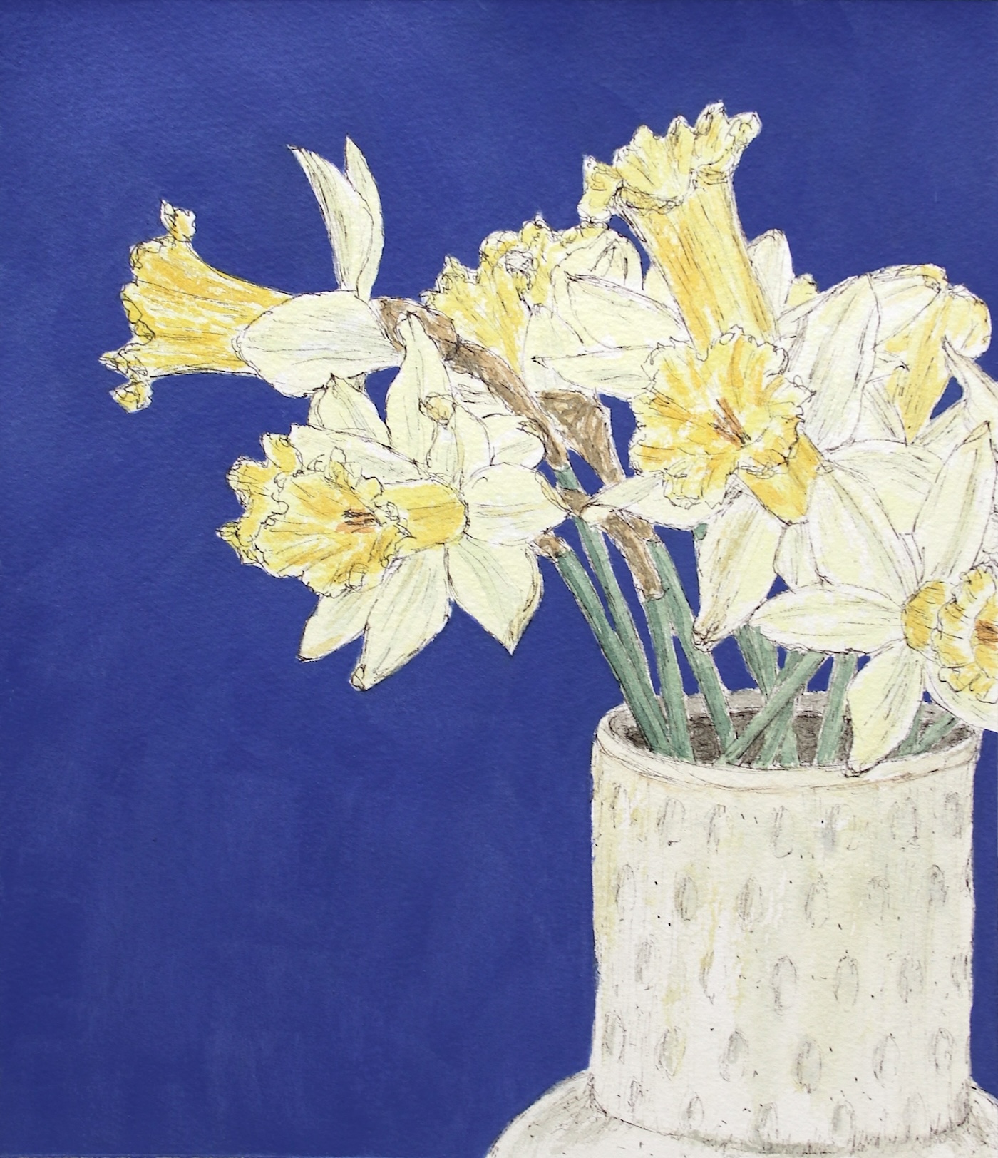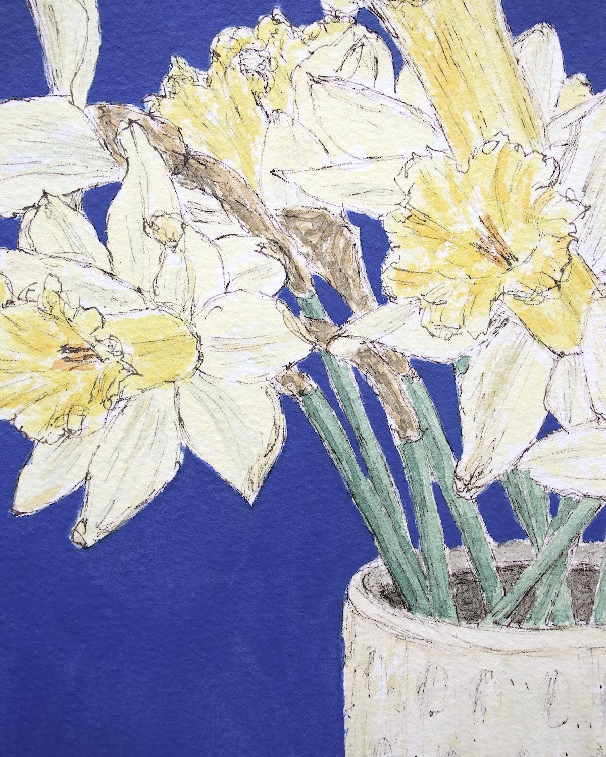 „Narzissen in Blau“ zeigt blassgelbe Narzissen vor einem kräftig blauen Hintergrund. Es handelt sich um eine Tintenzeichnung, die ich mit Aquarell ergänzt habe. Diese Technik wird im Englischen mit „line and wash“ bezeichnet.