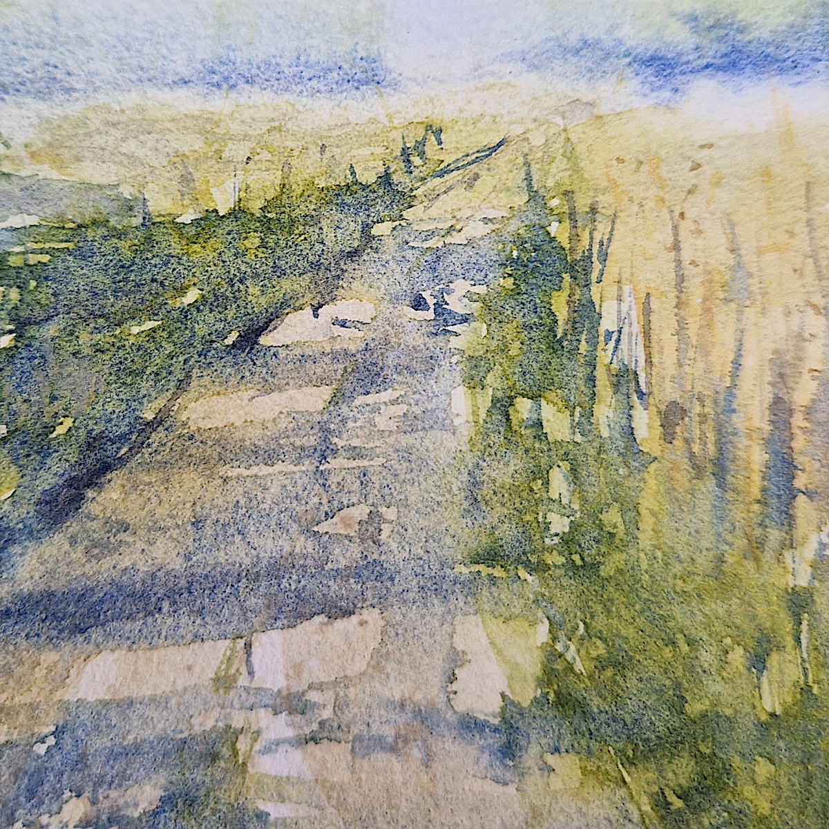„Spaziergang im Juni“ – Landschaftsaquarell, Papier, 28×28 cm, ungerahmt